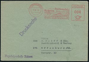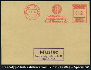 5195 | 35 € | POSTLEITRAUM 7500 (OHNE KARLSRUHE u. PFORZHEIM) : SINSHEIM (ELSENZ)/ BEBEG/ Badische Eisen-u./ Blechwarenfabrik/ Carl Baum & Co. 1939 (9.6.) AFS-Musterabdruck Francotyp "Reichsadler" (Firmen-Logo) glasklar gest. Francotyp-Musterblatt vom V o r - Ersttag ! (mit Attest), selten! (Dü.E-5CGo) | ![]() ![]() | |