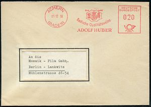 5030 | 10 € | POSTLEITRAUM 7500 (OHNE KARLSRUHE u. PFORZHEIM) : ACHERN/ (BADEN)/ Badische Qualitäsweine/ A.HUBER 1959 (9.12.) AFS Francotyp "Posthorn" (Logo mit Weintraube u. Posthorn) rs. motivgl. Abs.-Vordruck, Fern-Bf. (Dü.E-23CG) | ![]() ![]() | |