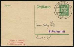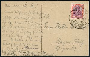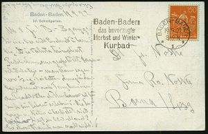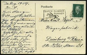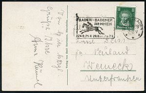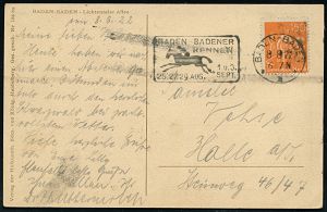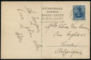 5038 | 20 € | POSTLEITRAUM 7500 (OHNE KARLSRUHE u. PFORZHEIM) : BADEN-BADEN/ *1*/ INTERNAT./ RENNEN/ ..26.28.30.AUGUST/ u.1.SEPTEMBER 1921 (30.8.) MWSt vom 3. Renntag! auf EF 30 Pf. Germania, klar gest. Ausl.-Color-Ak.: Yburg bei Baden-Baden n. Belgien (Bo.2 A 30.8. = 3. Renntag!) | ![]() ![]() | |
