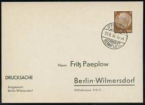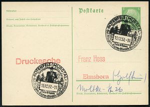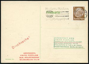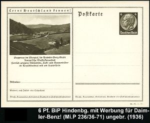 5126 | 8 € | POSTLEITRAUM 7500 (OHNE KARLSRUHE u. PFORZHEIM) : Gaggenau 1936 6 Pf. BiP Hindenbg., braun: .. die Daimler-Benz-Stadt.. , ungebr. (Mi.P 236/36-71-1-B1) | ![]() | |