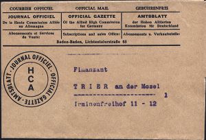 5071 | 25 € | POSTLEITRAUM 7500 (OHNE KARLSRUHE u. PFORZHEIM) : Baden-Baden 1947 (ca.) dreisprachiges Zeitungs-Streifband:: AMTSBLATT der Hohen Alliierten Kommission für Deutschland/ GEBÜHRENFREI.. (gedrucktes Dienstsiegel: JOURNAL OFFICIEL/H C A nach Trier (ex Slg. A. Meschenmoser!) | ![]() | |