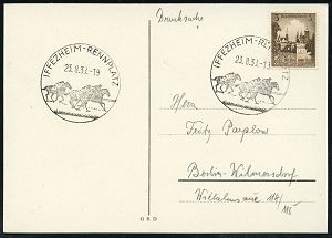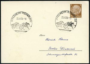 5143 | 18 € | POSTLEITRAUM 7500 (OHNE KARLSRUHE u. PFORZHEIM) : IFFEZHEIM-RENNPLATZ 1937 (27.8.) SSt ohne Text = Galopper , klar gest. Inl.-Bf. (Bo.2 , I.Verwendung = 3. Rennen ) | ![]() | |