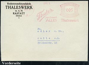 5170 | 16 € | POSTLEITRAUM 7500 (OHNE KARLSRUHE u. PFORZHEIM) : RASTATT/ Thales/ rechnet/ ALLES/ Thaleswerk 1939 (8.11.) AFS Francotyp "Bogenrechteck" auf Firmen-Vorderseite: Rechenmaschinenfabrik THALESWERK.. (Thales v. Milet = griech. Mathematiker u.Astronom) (Dü.E-1CEh) | ![]() | |