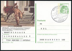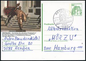 5190 | 14 € | POSTLEITRAUM 7500 (OHNE KARLSRUHE u. PFORZHEIM) : 7592 RENCHEN 1/ GRIMMELSHAUSEN-/ STADT 1982 (Okt.) HWSt auf orts- u. motivgl. BiP 50 Pf.: Grimmelshausen-Denkmal (Mi.P 134 / j 14-210) Inl.-Karte, seltene Kombination! (Bo.4 II) | ![]() | |