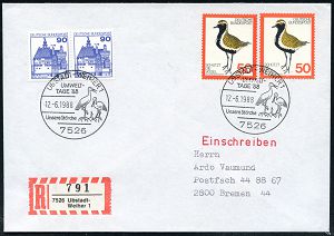 5198 | 18 € | POSTLEITRAUM 7500 (OHNE KARLSRUHE u. PFORZHEIM) : 7526 UBSTADT-WEIHER 1/ UMWELT-/ TAGE´88/ Unsere Störche 1988 (12.6.) SSt (2 Störche) auf passender Frankatur 2x 50 Pf. Vogelschutz etc. (Mi.901 u.a.) + RZ: 7526 Ubstadt-/Weiher 1, klar gest. Inl.-R-Bf. | ![]() | |