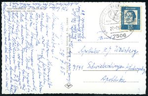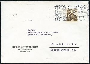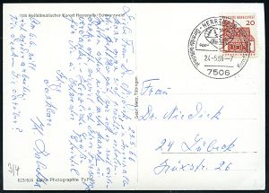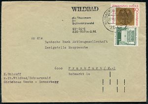 5206 | 18 € | POSTLEITRAUM 7500 (OHNE KARLSRUHE u. PFORZHEIM) : 7547 WILDBAD IM SCHWARZWALD 1/ d.Thermen.. 1969 (27.10.) MWSt auf 20 Pf. Lorsch + Horizontal-Halbierung 30 Pf. "20 Jahre BRD" , unbeanstandeter codierter Fernbf. (AEG-Telefunken-Sortieranlage) Unikat n. Ffm. (Mi.491 + 585 Halbierung) | ![]() | |
