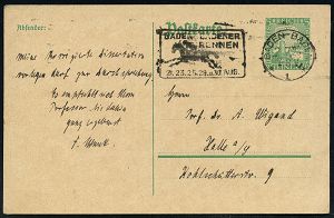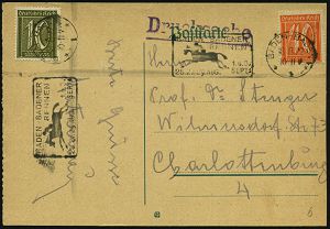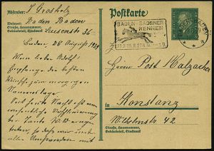 5039 | 18 € | POSTLEITRAUM 7500 (OHNE KARLSRUHE u. PFORZHEIM) : BADEN-BADEN/ *1*/ ..RENNEN/ 25.27.29.AUG./ 1.u.3./ SEPT. 1922 (8.8.) MWSt = Galopper 2x , 1x vertikal ! , sauber gest. Bedarfs-Kt. n. Berlin (Bo.6 A, 2 x) | ![]() | |