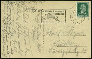 5048 | 15 € | POSTLEITRAUM 7500 (OHNE KARLSRUHE u. PFORZHEIM) : BADEN-BADEN/ **a/ RENNEN/ 26,28,30.AUG. 2.u.4.SEPT. 1927 (25.7.) MWSt = Galopper , klar gest., kleiner Fern-Bf. (Bo.12 A , nur kurze Verwendung!) | ![]() | |