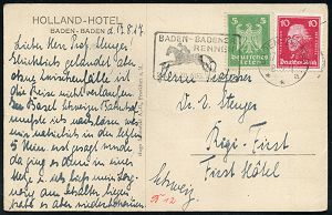 5049 | 16 € | POSTLEITRAUM 7500 (OHNE KARLSRUHE u. PFORZHEIM) : BADEN-BADEN/ **a/ RENNEN/ 26,28,30.AUG. 2.u.4.SEPT. 1927 (17.8.) MWSt = Galopper , klar gest. s/w.-Foto-Ak.: HOLLAND-HOTEL.. in die Schweiz (Bo.12 A , nur kurze Verwendung!) | ![]() ![]() | |