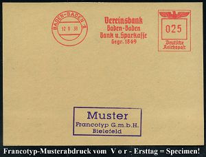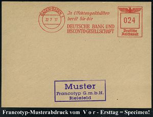 5060 | 35 € | POSTLEITRAUM 7500 (OHNE KARLSRUHE u. PFORZHEIM) : BADEN-BADEN 1/ Jn Effektengeschäften../ DEUTSCHE BANK UND/ DISCONTO-GESELLSCHAFT 1937 (22.7.) AFS-Musterabdruck Francotyp "Reichsadler" , glasklar gest. Francotyp-Musterblatt vom V o r - Ersttag ! (mit Attest), selten! (Dü.5CGo) | ![]() ![]() | |