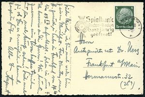 5063 | 14 € | POSTLEITRAUM 7500 (OHNE KARLSRUHE u. PFORZHEIM) : BADEN-BADEN 1/ r/ Spielbank../ Ganzjährig/ geöffnet! 1938 (19.8.) MWSt (Roulette) auf s/w.-Foto-Ak.: Teilansicht mit Parkbank, Bedarf = ex Slg. G. Heyd (Bo.23 A II , nur 1937-39 verwendet) | ![]() ![]() | |