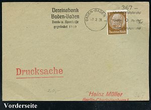 5067 | 30 € | POSTLEITRAUM 7500 (OHNE KARLSRUHE u. PFORZHEIM) : BADEN-BADEN 1/ =367=/ Vereinsbank/ Baden-Baden.. 1938 (7.2.) seltener Freimarkenstempel mit Kennung = Frankier- u.Stempelmaschine zur Vorausentwertung (der Fa. Telefonbau & Normalzeit) klar gest. Teil-Vorderseite, vergl. Kat.-Nr. 5066 | ![]() | |