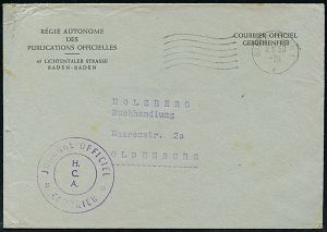 5074 | 18 € | POSTLEITRAUM 7500 (OHNE KARLSRUHE u. PFORZHEIM) : BADEN-BADEN 1/ r 1950 (8.12.) MaWellenSt ohne Text auf Dienst-Bf.: COURRIER OFFICIEL/ GEBÜHRENFREI, REGIE AUTONOMIE DES PUBLICATIONS OFFICIELLES.. + viol. HdN: H.C.A.= Alliiierterr Hochkommissar n. Oldenbg. (vergl. Kat.-Nr.5071) | ![]() | |