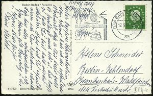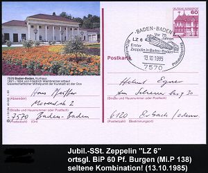 5086 | 14 € | POSTLEITRAUM 7500 (OHNE KARLSRUHE u. PFORZHEIM) : 7570 BADEN-BADEN 1/ Vor 75 Jahren/ LZ 6/ Erster Zeppelin in Baden-Baden.. 1985 (13.10.) SSt = Zeppelin "LZ 6" auf ortsgleicher BiP 60 Pf. Burgen: 7570 Baden-Baden, Kurhaus.. , Inl.-Karte, seltene Kombination! (Mi.P 138) | ![]() | |