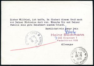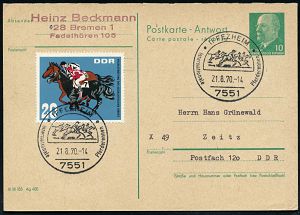 5149 | 20 € | POSTLEITRAUM 7500 (OHNE KARLSRUHE u. PFORZHEIM) : 7551 IFFEZHEIM/ Internat.Pferderennen 1970 (21.8.) SSt = Galopper 2x auf DDR-Antwort-P 10 Pf. Ulbricht (Mi.P 77 A) + motivgl. DDR 20 Pf. Galoppsport (Mi.1304) zulässige, seltene Antwort-Kt. in die DDR, = Unikat in dieser Form! (Bo.4 , VIII. Verwendung) | ![]() | |