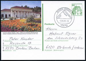 5082 | 14 € | POSTLEITRAUM 7500 (OHNE KARLSRUHE u. PFORZHEIM) : 7570 BADEN-BADEN 1/ 11.Olympischer/ Kongreß 1981 (3.10.) SSt auf ortsgleicher BiP 50 Pf. Burgen, grün: Kurhaus Baden-Baden.. von Friedr. Weinbrnner (Mi.P 134), klar gest. Inl.-Karte, seltene Kombination! (Bo.99) | ![]() | |