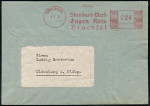 5099 | 28 € | POSTLEITRAUM 7500 (OHNE KARLSRUHE u. PFORZHEIM) : BRUCHSAL/ Standard-Werk/ Eugen Reis 1947 (8.5.) seltener, aptierter AFS Francotyp "Mäanderrechteck", Inschrift = "DEUTSCHES REICH" entfernt = Notmaßnahme! , klar gest. Fern-Bf. (Dü.E-11 E-77h) | ![]() | |
