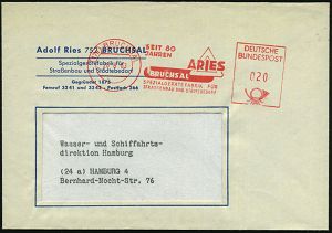 5100 | 14 € | POSTLEITRAUM 7500 (OHNE KARLSRUHE u. PFORZHEIM) : (17a) BRUCHSAL/ SEIT 80/ JAHREN/ ARIES/ SPEZIALGERÄTEFABRIK FÜR/ STRASSENBAU U.STÄDTEBDARF 1963 (28.8.) Jubil.-AFS Postalia = Warndreieck , klar gest. Firmen-Bf. (Dü.E-23 B) | ![]() | |