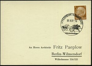 5140 | 15 € | POSTLEITRAUM 7500 (OHNE KARLSRUHE u. PFORZHEIM) : IFFEZHEIM/ RENNPLATZ 1937 (23.8.) 1K-Gitter-SSt = Hauspostamt Galopp-Rennbahn! (alte Form) klar vom Eröffnungstag auf Inl.-Karte (Bo.1 /V.Verwendung, 1.Tag) | ![]() | |
