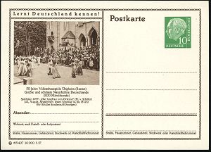 5164 | 8 € | POSTLEITRAUM 7500 (OHNE KARLSRUHE u. PFORZHEIM) : Ötigheim 1957 10 Pf. BiP Heuss I, grün: .."Die Jungfrau v. Orleans" (Fr.v.Schiller).. (Tanzszene) ungebr. (Mi.P 24/269) | ![]() | |