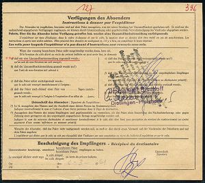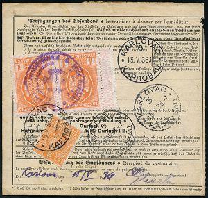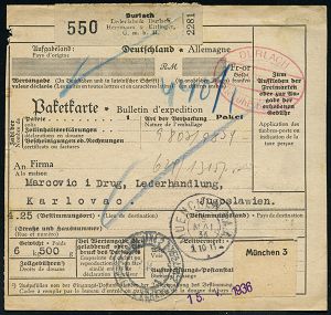 5117 | 28 € | POSTLEITRAUM 7500 (OHNE KARLSRUHE u. PFORZHEIM) : DURLACH/ **/ Gebühr bezahlt 1936 (8.5.) Doppeloval-PFS + schw. Selbstbucher-Paketzettel: Durlach/ Lederfabrik Durlach/ Hermann & Ettlinger/G.m.b.H. + Tranit-2K: MUENCHEN 3 A.A., klar gest. Ausl.-Paket-Kt. n. Karlovac, rs. jugoslaw. Tax- u. Fiskalmarken (Dü.A-5, Nr.20) | ![]() ![]() | |
