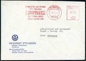 5124 | 12 € | POSTLEITRAUM 7500 (OHNE KARLSRUHE u. PFORZHEIM) : 7505 ETTLINGEN 1/ ..VW-Händler/ STOPPANSKI.. 1971 (3.5.) AFS Stielow-Neopost "Posthorn" auf Firmen-Bf. mit VW-Logo (Dü.E-26 G) | ![]() | |