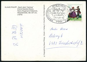 5151 | 12 € | POSTLEITRAUM 7500 (OHNE KARLSRUHE u. PFORZHEIM) : 7551 IFFEZHEIM/ Internatiionale Galopprennen 1981 (9.5.) SSt = Galopper auf passender Künstler-Color-Ak.: "Nach dem Training" (von Klaus Philipp), Inl.-Karte, schöne Kombination! (Bo.6) | ![]() ![]() | |