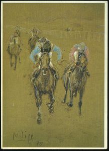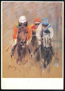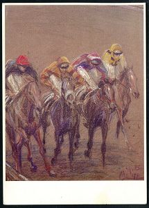 5154 | 12 € | POSTLEITRAUM 7500 (OHNE KARLSRUHE u. PFORZHEIM) : 7551 IFFEZHEIM/ Internatiionale Galopprennen 1981 (9.5.) SSt = Galopper auf passender Künstler-Color-Ak.: "Drei Jockeys.." (von Klaus Philipp, Inl.-Karte,, schöne Kombination! (Bo.6) | ![]() ![]() | |