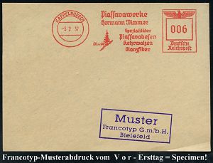 5158 | 35 € | POSTLEITRAUM 7500 (OHNE KARLSRUHE u. PFORZHEIM) : KAPPELRODECK/ Piassvawerke/ Hermann Wimmer/ ..Piassavabesen/ Kehrwalzen/ Glanzfiber 1937 (5.2.) AFS-Musterabdruck Francotyp "Reichsadler" (Tannen-Logo) glasklar gest. Francotyp-Musterblatt vom V o r - Ersttag! (mit Attest), selten! (Dü.E-5CG) | ![]() ![]() | |