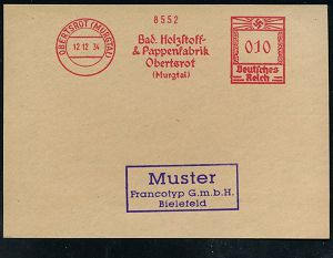 5163 | 35 € | POSTLEITRAUM 7500 (OHNE KARLSRUHE u. PFORZHEIM) : OBERTSROT (MURGTAL)/ Ba.Holzstoff-/ & Pappenfabrik.. 1934 (12.12.) AFS-Musterabdruck Francotyp "Hakenkreuz" , glasklar gest. Francotyp-Musterblatt vom V o r - Ersttag ! (mit Attest), selten! (Dü.E-3CEh) | ![]() ![]() | |