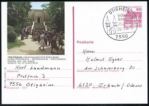 5165 | 14 € | POSTLEITRAUM 7500 (OHNE KARLSRUHE u. PFORZHEIM) : 7556 ÖTIGHEIM/ Volks-/ Schauspiele.. 1986 (26.7.) HWSt (Doppelturm) auf ortsgleicher BiP 60 Pf. Burgen, lilarot: 7556 Örigheim, Volksschauspielort.. (Szene aus "Joseph aus Ägypten", Altertum) Inl.-Karte, seltene Kombination! (Mi.P 138) | ![]() | |