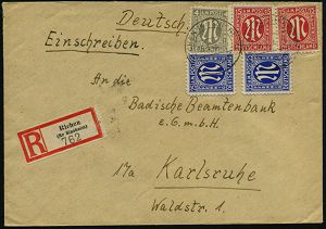 5191 | 18 € | POSTLEITRAUM 7500 (OHNE KARLSRUHE u. PFORZHEIM) : RICHEN (Kr SINSHEIM)/ a 1946 (15.3.) 2-Steg 2x auf AM-Post Dreifarben-Frankatur 4 Pf., je 2x 15 Pf. u. 25 Pf. + RZ: Richen/(Kr Sinsheim) , klar gest. Inl.-R-Bf. n. Karlsruhe | ![]() | |