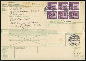 5197 | 16 € | POSTLEITRAUM 7500 (OHNE KARLSRUHE u. PFORZHEIM) : 7521 UBSTADT-WEIHER 3/ a 1976 (20.4.) 1K-Segment auf 200 Pf. Technik: Erdöl-Bohrinsel, hohe Massen-Frankatur, 6 Stück vs. (wie MeF u.a. rs.) + brauner Paketzettel: 7521 Ubstadt-Weiher 3, klar gest. Übersee-Paketkt. n. USA, seltene Portostufe! (Mi.858 u.a. rs.) | ![]() ![]() | |