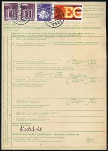 5166 | 35 € | POSTLEITRAUM 7500 (OHNE KARLSRUHE u. PFORZHEIM) : RASTATT/ ** 1980 (2.11.) kleiner 1K 4x auf senkr. 3er-Streifen 10 Pf. kl.Adler + vs. div. blaue, hs. Vermerke, rs. AS: MALSCH/ AMT ETTLINGEN (Ra.3), frühe Post-Zustellurkunde mit Inhalt!, seltenes Porto! (Mi.41 MeF) | ![]() ![]() ![]() | |