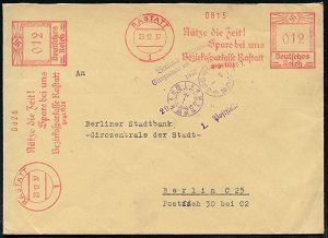 5171 | 25 € | POSTLEITRAUM 7500 (OHNE KARLSRUHE u. PFORZHEIM) : RASTATT/ 1/ Nütze die Zeit!/ Spare bei uns/ Bezirkssparkasse Rastatt.. 1937 (23.12.) AFS Francotyp "Hakenkreuz" 012 Pf. + 012 Pf. = 2 Abdrucke , aufgewerteter Fern-Doppel-Bf. = 24 Pf. n. Berlin (Dü.E-3CEh) | ![]() | |