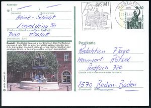5180 | 14 € | POSTLEITRAUM 7500 (OHNE KARLSRUHE u. PFORZHEIM) : 7550 RASTATT 1/ mu/ RASTATT/ 900 JAHRE.. 1984 (24.5.) MWSt (Wappen) auf ortsgleicher BiP 6ß Pf. Burgen, lilarot: 7550 Rastatt.. Der Bernhardusbrunnen.. (Markgraf Bernhard v. Baden) Bedarf! (Mi.P 138), seltene Kombination! (Bo.27 A) | ![]() | |