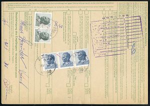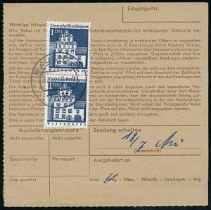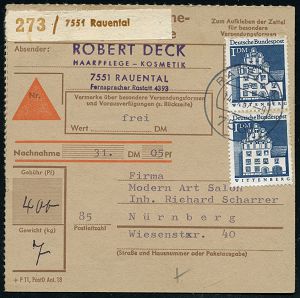5186 | 16 € | POSTLEITRAUM 7500 (OHNE KARLSRUHE u. PFORZHEIM) : 7551 RAUENTAL/ a 1967 (14.7.) 1K-Segment auf 4x 1.- DM Melanchtonhaus Wittenberg (2 Stück rs.) + brauner Paketzettel: 7551 Rauental , klar gest. Inl.-NN-Paket-Kt.: ROBERT DECK, HAARPFLEGE - KOSMETIK n. Nürnberg (Mi.500 MeF) | ![]() ![]() | |