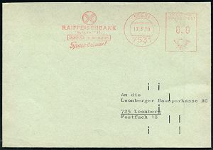 5196 | 10 € | POSTLEITRAUM 7500 (OHNE KARLSRUHE u. PFORZHEIM) : 7531 STEIN/ RAIFFEISENBANK/ ..Spare bei uns! 1970 (17.3.) AFS Francotyp (Firmen-Logo) + schw. Matrix-Code (= AEG-Telefunken-Sortieranlage) Fern-Bf. n. Leonberg (Dü.E-26) | ![]() | |
