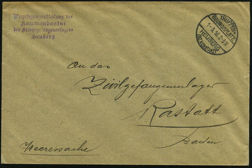 5398 | 18 € | POSTLEITRAUM 7700 (OHNE SINGEN) : HEUBERG/ (BZ.KONSTANZ)/ TRUPPEN=/ ÜBUNGSPLATZ 1916 (1.3.) 1K-Brücke + viol.HdN: Bekleidungskasse/Kgf.-Lager Heuberg.. + rs. roter 2K-HdN.: KOMMANDANTUR.. HEUBERG , Heeres-Dienstbf. an das Zivil-Gefangenenlager Rastatt ! | ![]() ![]() | |
