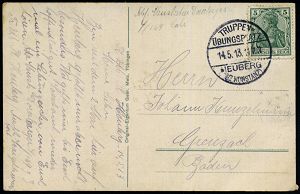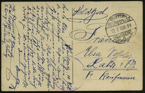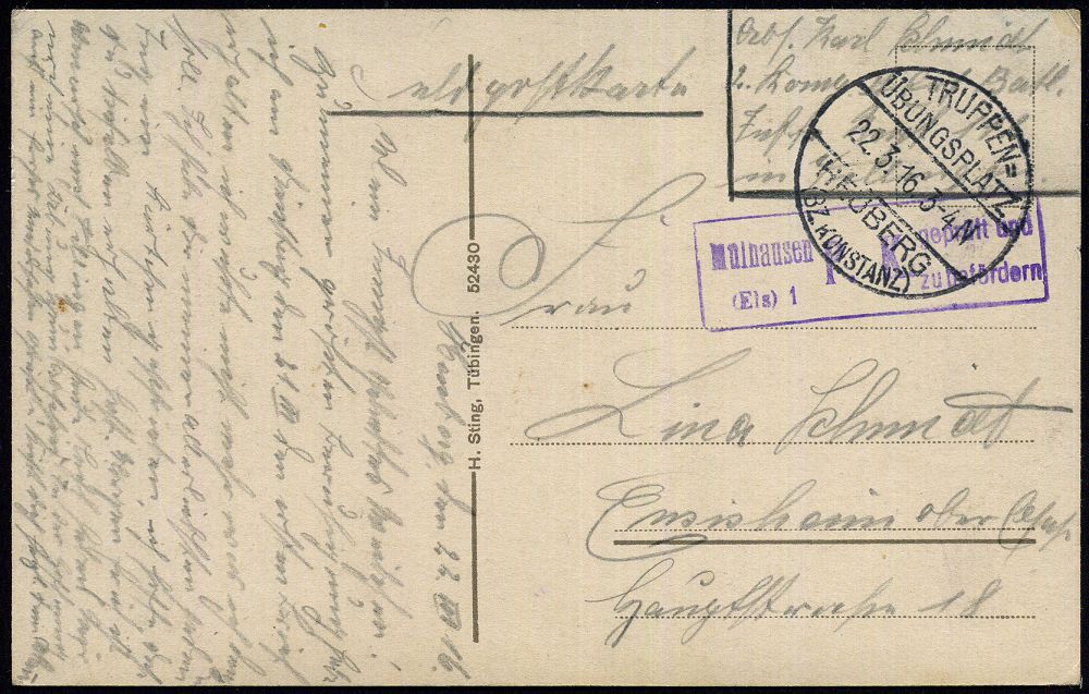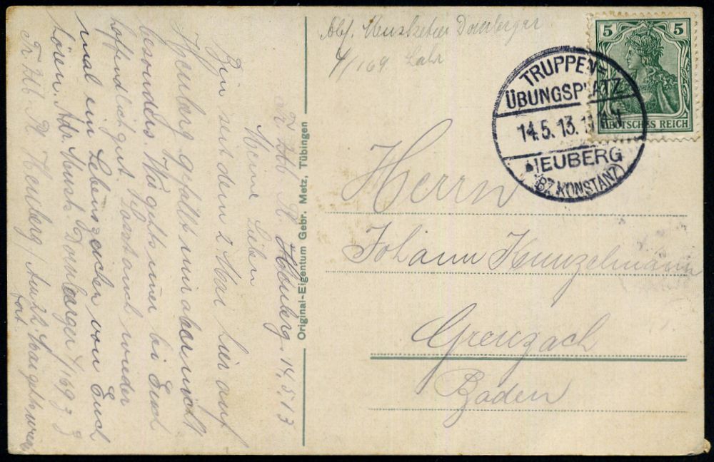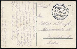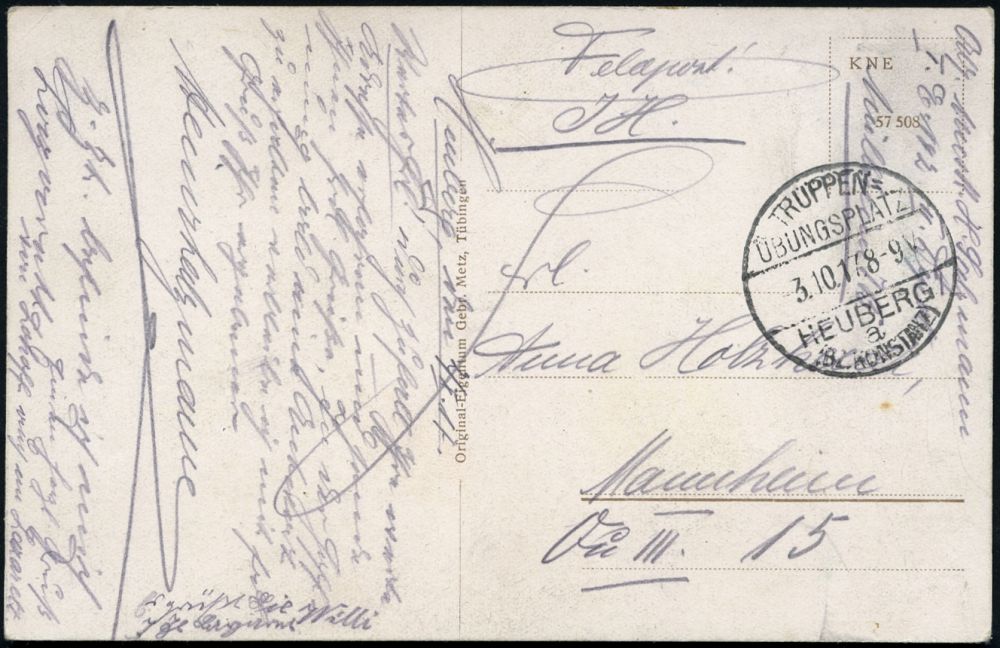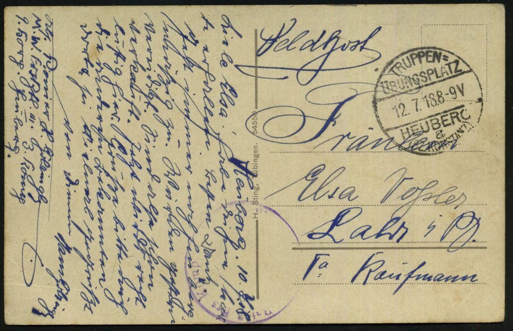 5403 | 12 € | POSTLEITRAUM 7700 (OHNE SINGEN) : HEUBERG/ a/ (BZ.KONSTANZ)/ TRUPPEN=/ ÜBUNGSPLATZ 1918 (12.7.) 1K-Brücke mit UB "a" = Hauspostamt Truppen-übungsplatz + hs. Abs.: ".. Pionier.. M.W. Ersatz Btl. III.." auf Color-Foto-Feldpost-Ak.: Mühlheim, Schloß aus dem letzten Kriegsjahr n. Lahr | ![]() ![]() | |