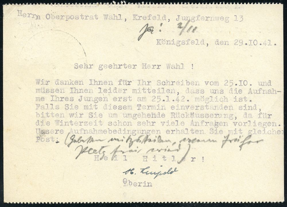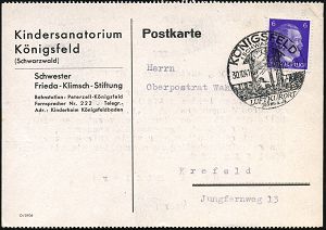 5423 | 20 € | POSTLEITRAUM 7700 (OHNE SINGEN) : KÖNIGSFELD/ (SCHWARZW)/ LUFTKURORT.. 1941 (30.10.) HWSt (Wald) auf seltener Vordr.-Kt.: Kindersanatorium ..Schwester Frieda-Klimsch-Stiftung (Bo.2 , Erstjahr!) | ![]() ![]() | |