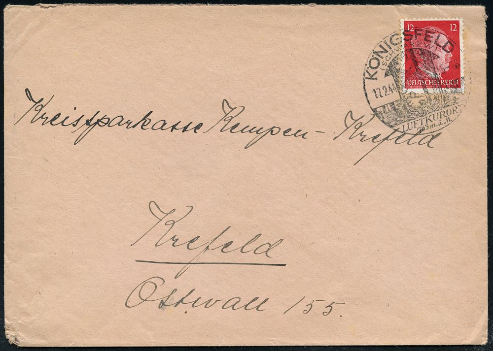 5424 | 14 € | POSTLEITRAUM 7700 (OHNE SINGEN) : KÖNIGSFELD/ (SCHWARZW)/ LUFTKURORT.. 1944 (17.2.) HWSt (Hochwald) klar auf Bedarfs-Bf. (kl. Eckfehler) n. Krefeld (Bo.2 , Letzjahr III. Reich) | ![]() | |