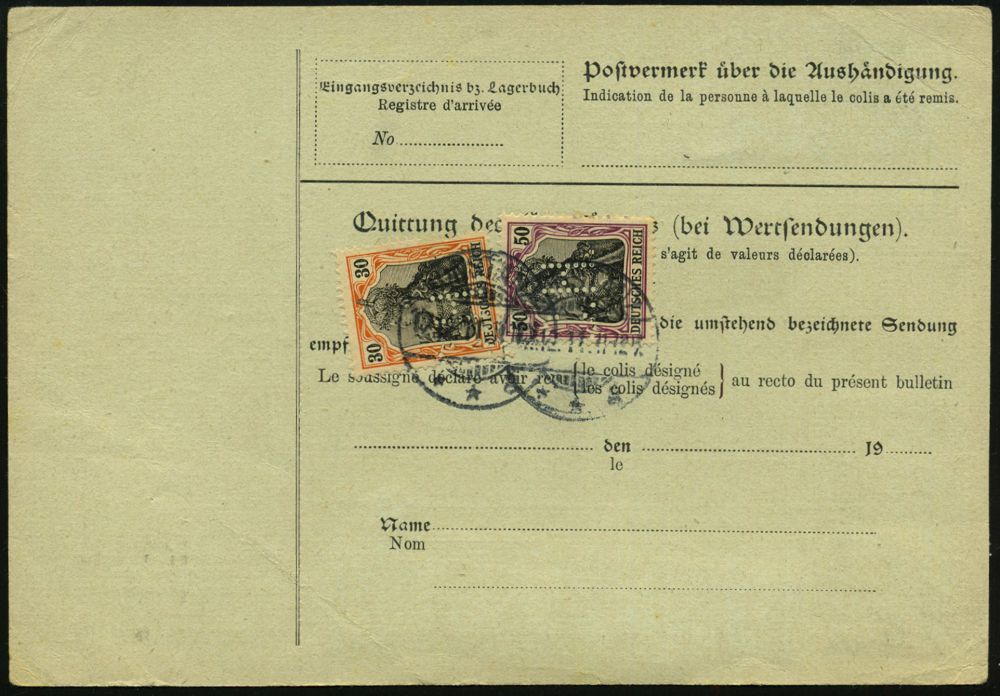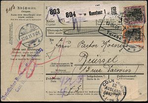 5426 | 25 € | POSTLEITRAUM 7700 (OHNE SINGEN) : KONSTANZ/ **g 1911 (12.12.) 1K-Gitter 2x auf 2x 30 Pf. uund 2x 50 Pf. Germania je Firmenlochung: "C. H." = C hristliche Buch- & Kunsthandlung Carl Hirsch , teils rs. frankiert + 2x schw. Paketzettel: * Konstanz 1 + viol. Abs.-2L, Ausl.-Paket-Kt. für 2 Pakete n. Brüssel (Mi.89 I (2), 91 I (2) , Perfin) | ![]() ![]() | |