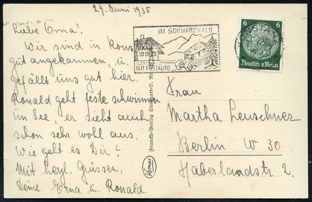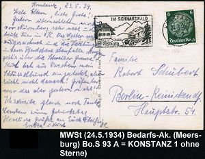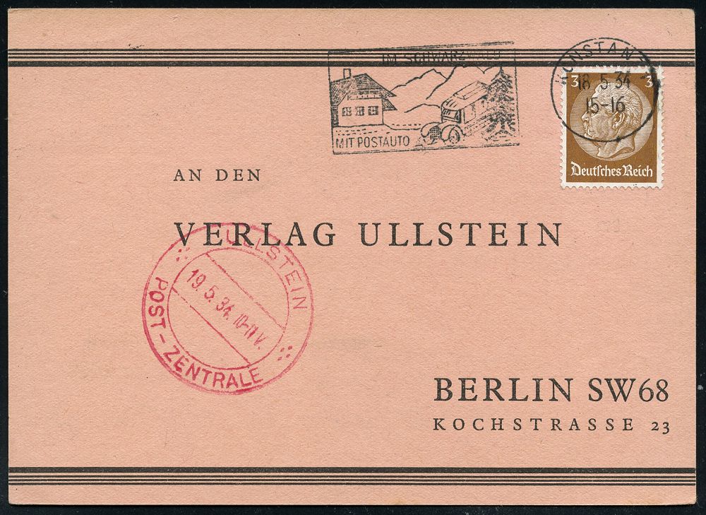 5433 | 25 € | POSTLEITRAUM 7700 (OHNE SINGEN) : KONSTANZ 1/ IM SCHWARZWALD/ MIT POSTAUTO 1934 (18.5.) MWSt (Postbus vor Schwarzwaldhaus) auf Reklame-Kt.: VERLAG ULLSTEIN + roter 2K-Steg: ULLSTEIN POST-ZENTRALE = jüdischer Verlag, von den Nazis enteignet unter der Tarnfirma "Cautio" zwangs-"arisiert"!, seltener Beleg! (Bo.S 03 A) | ![]() ![]() | |