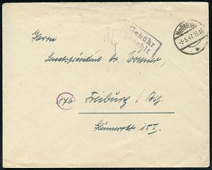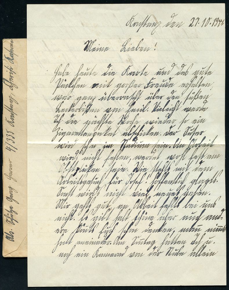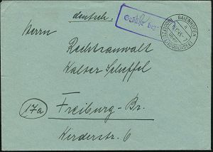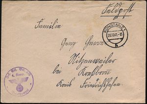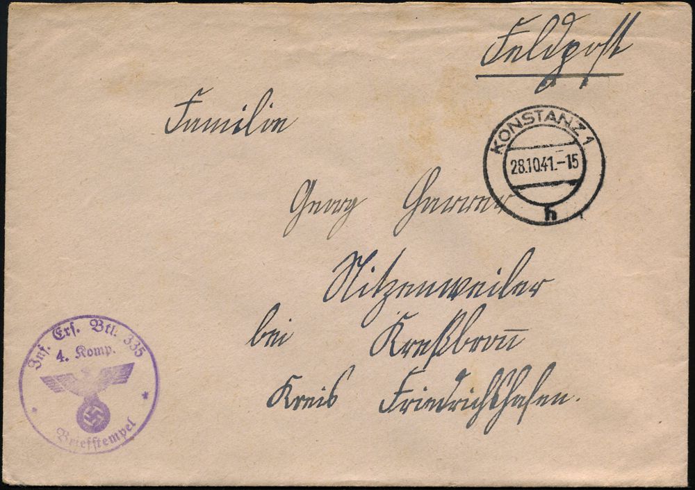 5439 | 15 € | POSTLEITRAUM 7700 (OHNE SINGEN) : KONSTANZ 1/ h 1941 (28.10.) 2K-Steg + viol. 1K.-HdN: Jnf. Ers. Btl. 335/4. Komp. , klar gest. Feldpost-Bf. + Inhalt n. Kreßbronn, 2 Belege kompl.! | ![]() ![]() | |