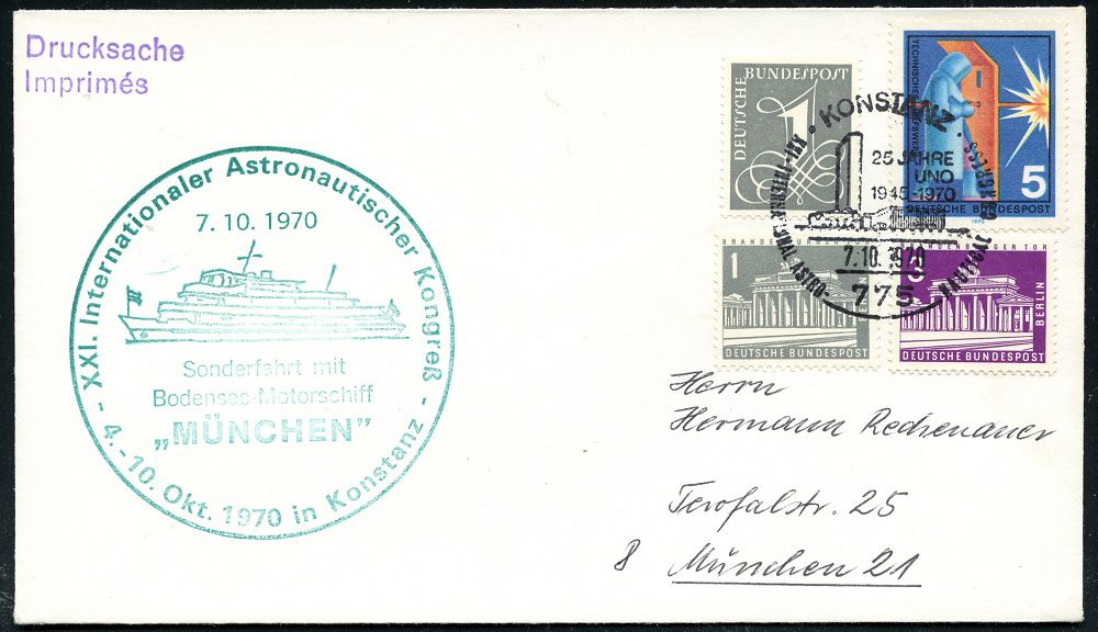 5448 | 25 € | POSTLEITRAUM 7700 (OHNE SINGEN) : 775 KONSTANZ/ XXI.INT.ASTRO-NAUTICAL CONGRESS/ 25 Jahre/ UNO 1970 (7.10.) SSt auf West-Berlin 1 Pf. + 3 Pf. Brandenbg. Tor u.a. (Mi.140 + 40.- EUR) = Berlin-Solidarität (UNO-Gebäude N.York) + grüner HdN: Sonderfahrt mit/ Bodensee MS/"MÜNCHEN"/XXI. Internat. Astronautischer Kongreß, Inl.-Bf (Bo.38) | ![]() | |