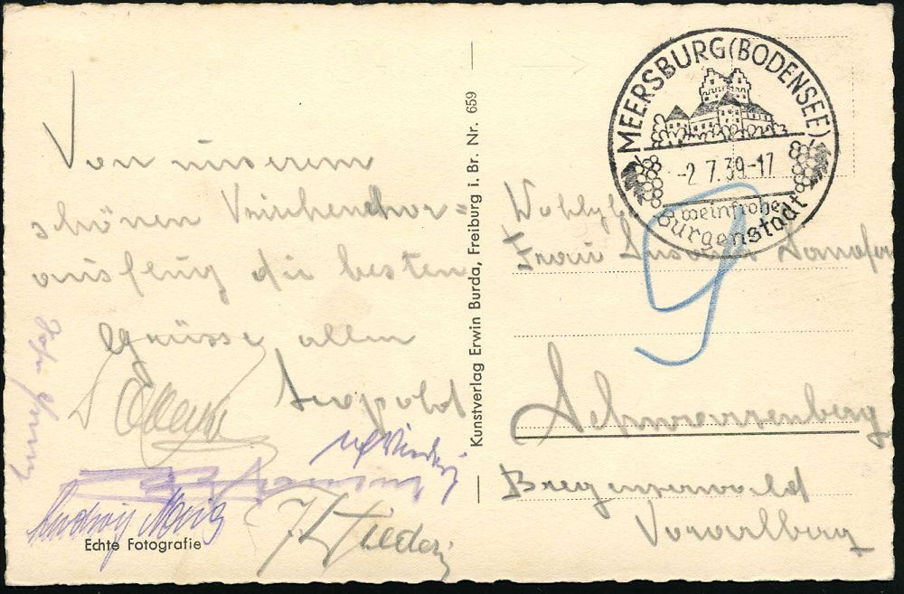5478 | 15 € | POSTLEITRAUM 7700 (OHNE SINGEN) : MEERSBURG (BODENSEE)/ weinfrohe/ Burgenstadt 1939 (2.7.) HWSt (Burg, 2Trauben) klar auf motivgl., s/w.-Foto-Ak., unfrankierter Nachporto-Ak. mit hs. Nachgebühr "9" (RPf.) (Bo.2) | ![]() ![]() | |