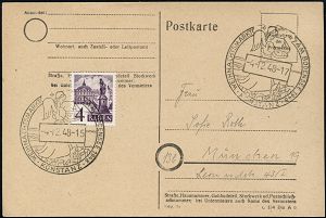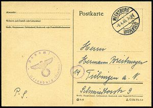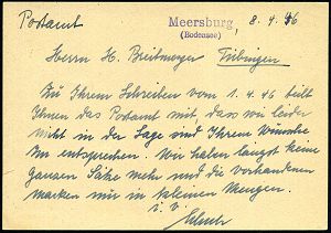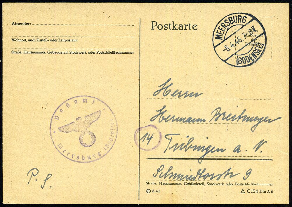 5479 | 18 € | POSTLEITRAUM 7700 (OHNE SINGEN) : MEERSBURG/ (BOSENSEE) 1946 (8.4.) 1K-Brücke + viol., aptierter 1K-HdN: Postamt/Meersburg (Bodensee) mit altem NS-Adler (nur Hakenkreuz entfernt!) Postdienst-Fernkt. betr. Antwort auf Markenanfrage | ![]() ![]() | |