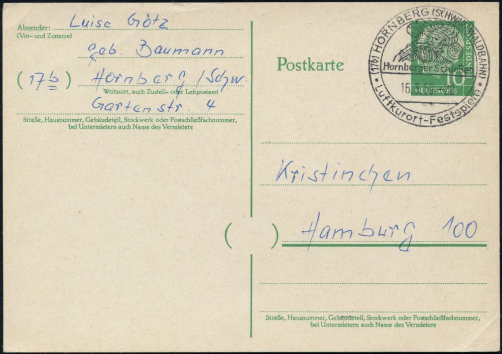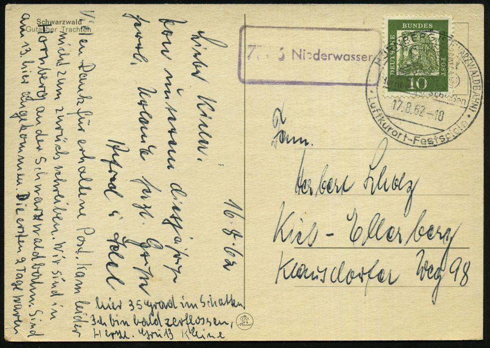 5412 | 12 € | POSTLEITRAUM 7700 (OHNE SINGEN) : HORNBERG (SCHWARZWALDBAHN)/ Hornberger Schießen.. 1962 (12.8.) aptierter HWSt = alte PLGZ entfernt + viol. Ra.: 7746 Niederwasser = PSt. II (PLZ teils etw. undeutl.) Color-Foto-Ak.: Gutacher Trachten, Bedarf (Bo.2 aptiert) | ![]() ![]() | |