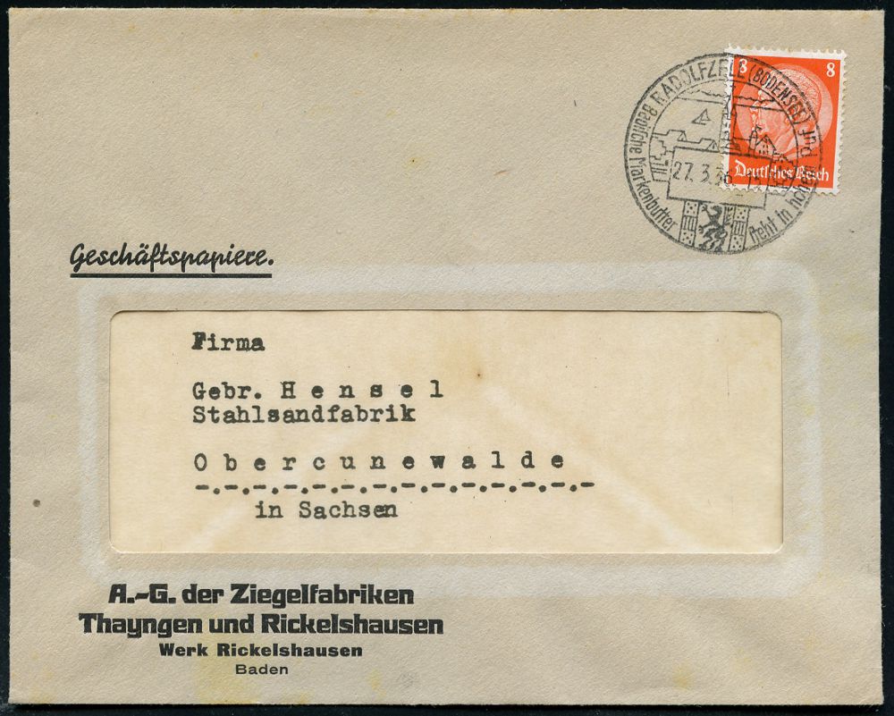 5486 | 18 € | POSTLEITRAUM 7700 (OHNE SINGEN) : RADOLFZELL (BODENSEE)/ Bad.Markenbutter steht in hohem Ruf 1936 (27.3.) HWSt auf EF 8 Pf. Hindenbg. (Ortsbild, badische Flagge m.Wappen) klar gest. Firmen-Bf.: A.-G. der Ziegelfabriken Thayngen u. Rickelshausen, Werk Rickelshausen.. (Bo.3, Letztjahr) | ![]() | |